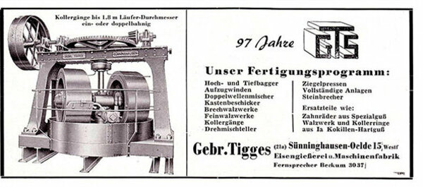 Die Vettern Ernst und Eduard Tigges leiten das Unternehmen. Der Maschinenpark in der Eisengießerei, der Modellschreinerei und in den Bearbeitungswerkstätten des Maschinenbaus werden komplett modernisiert. Eine Montagehalle für Großmaschinen sowie eine Drehereihalle werden errichtet. Die Entwicklungs- und Konstruktionsabteilung werden ausgebaut.
